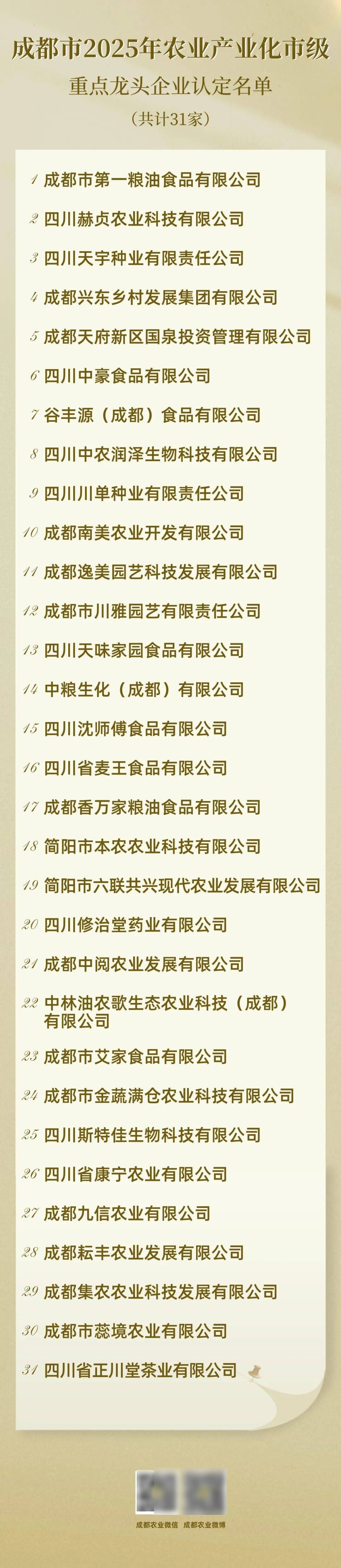 按照《成都会农业财产化市级沉点龙头企业认定和运转监测办理法子》(成委农办〔2025〕42号),市农业农村局开展了2025年农业财产化市级沉点龙头企业认定工做,确定了成都会第一粮油食物无限公司等!